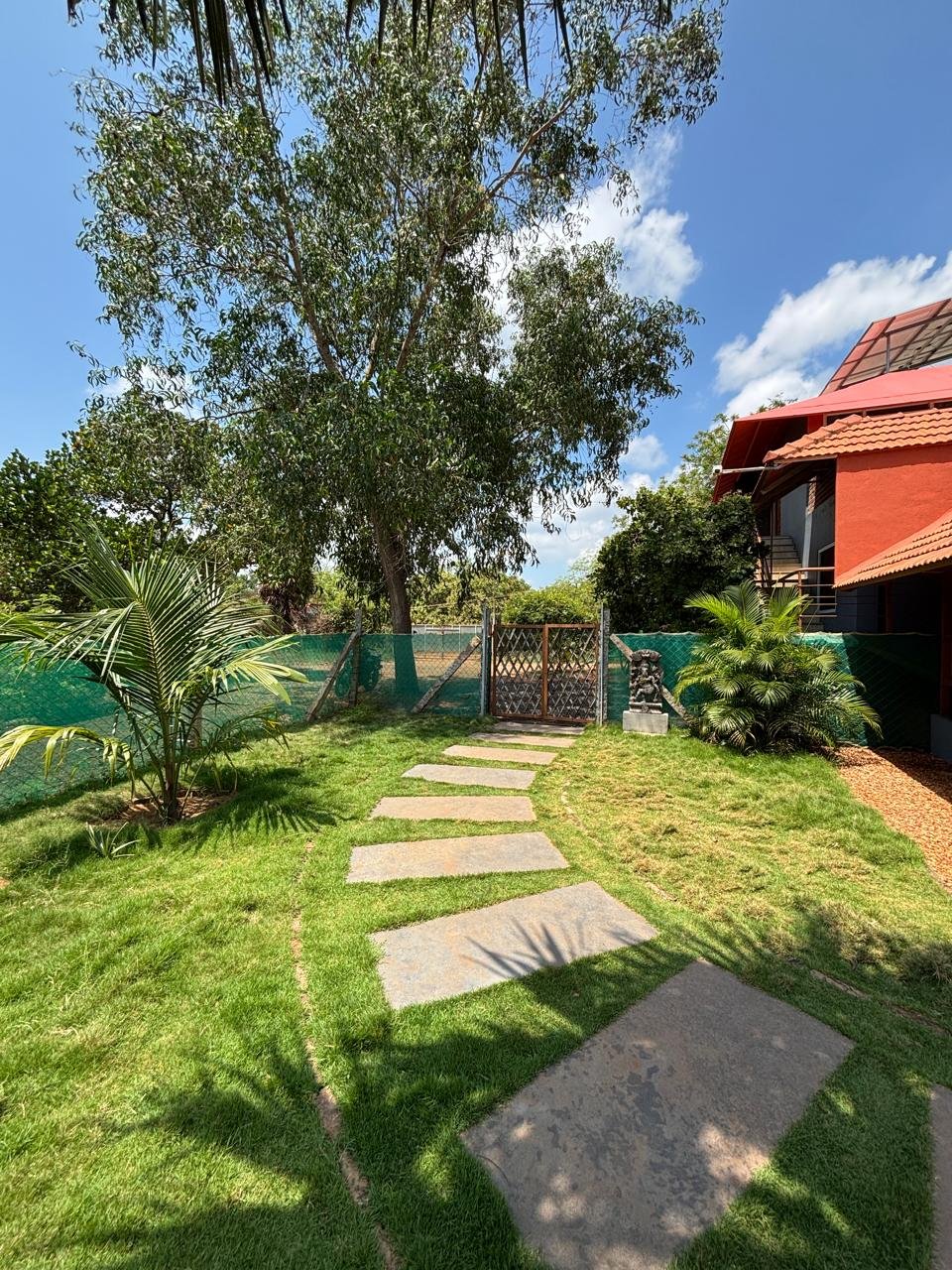 A wide, open lawn surrounds the villa, offering a perfect space for family picnics, outdoor games, or simply lying back and enjoying the breeze.